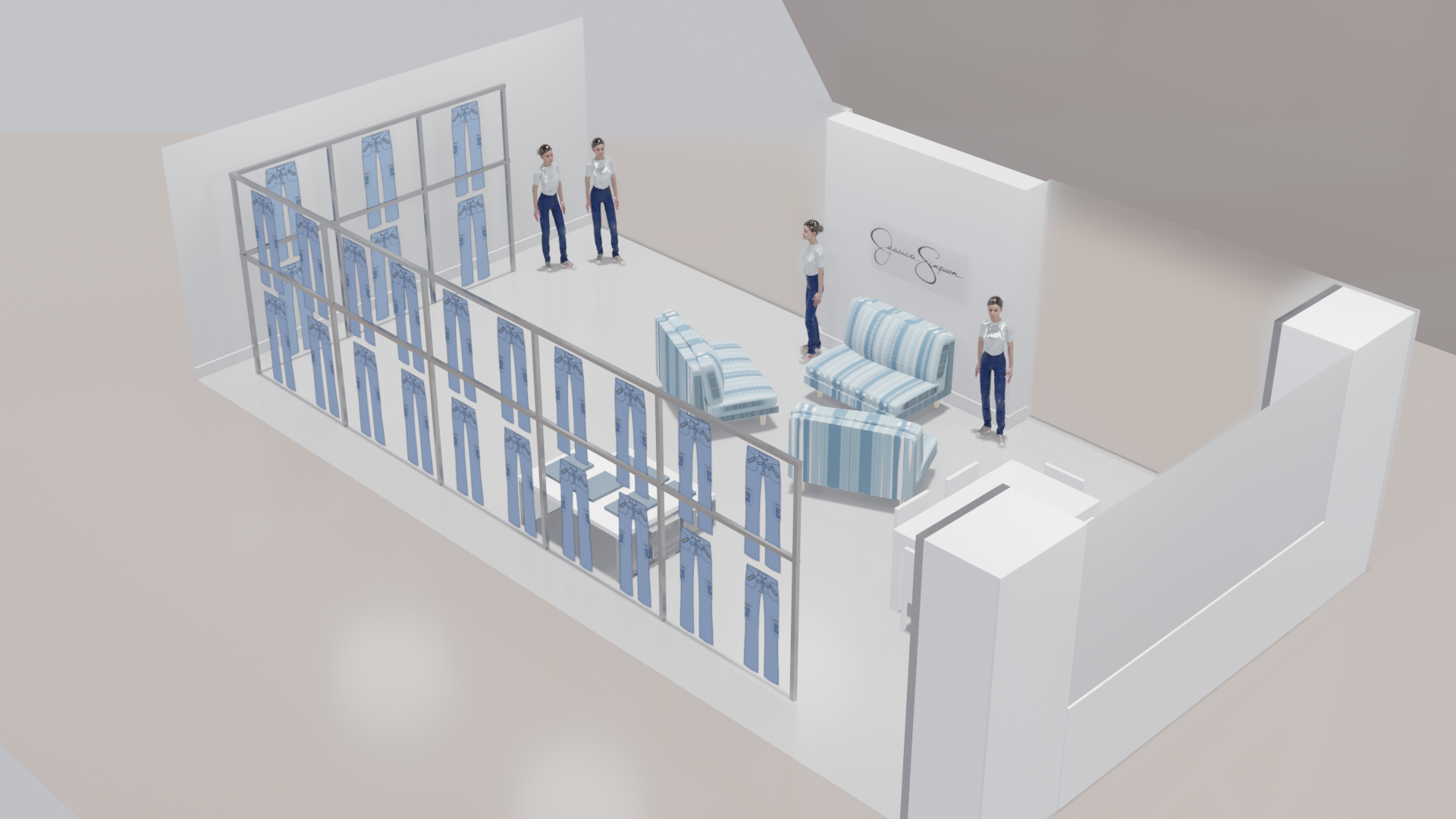Jessica Simpson, a well known womenswear brand, partnered with us to produce detailed 3D showroom renders and merchandising visuals for internal planning and retail presentations.